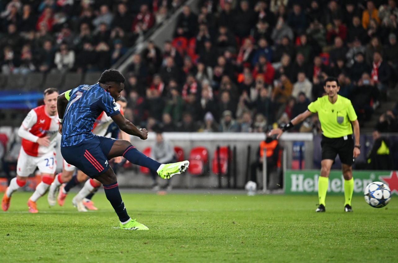 El Slavia comenzó con intensidad, pero el Arsenal se mostró sereno, con Gabriel Magalhães cerca temprano y Bukayo Saka probando dos veces a Jakub Markovič. En el minuto 30, Saka convirtió un penalti después de que un cabezazo de Gabriel golpeara la mano de Lukáš Provod (lo confirmó el VAR).
