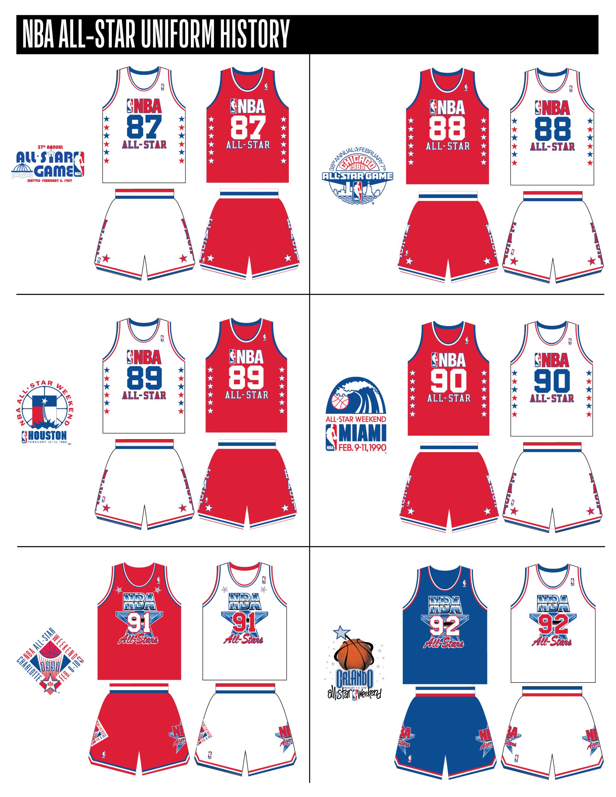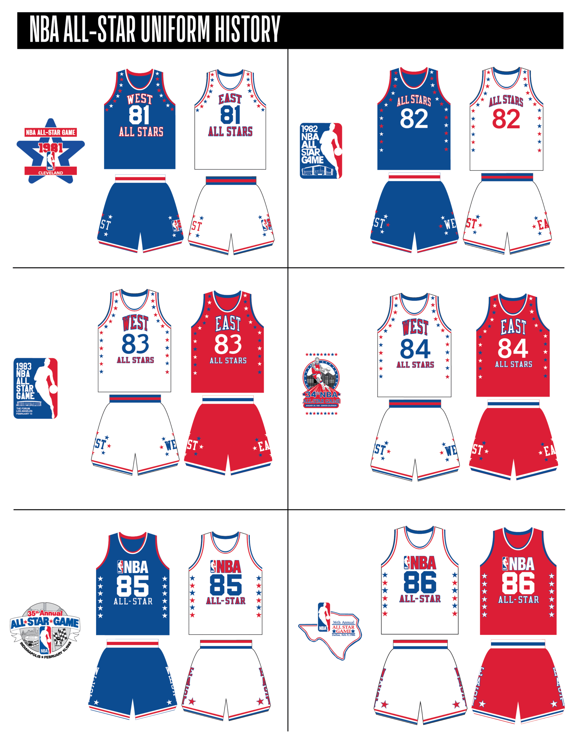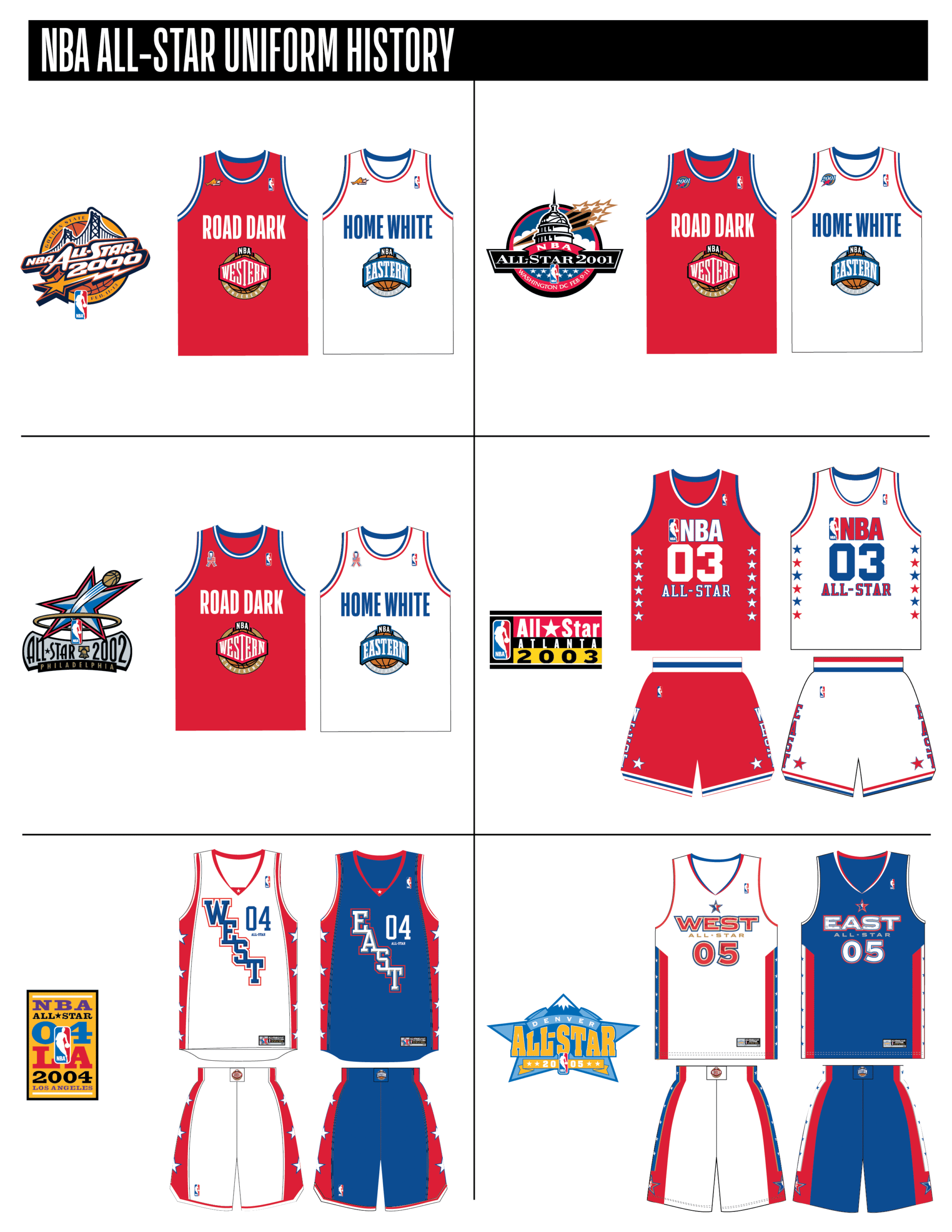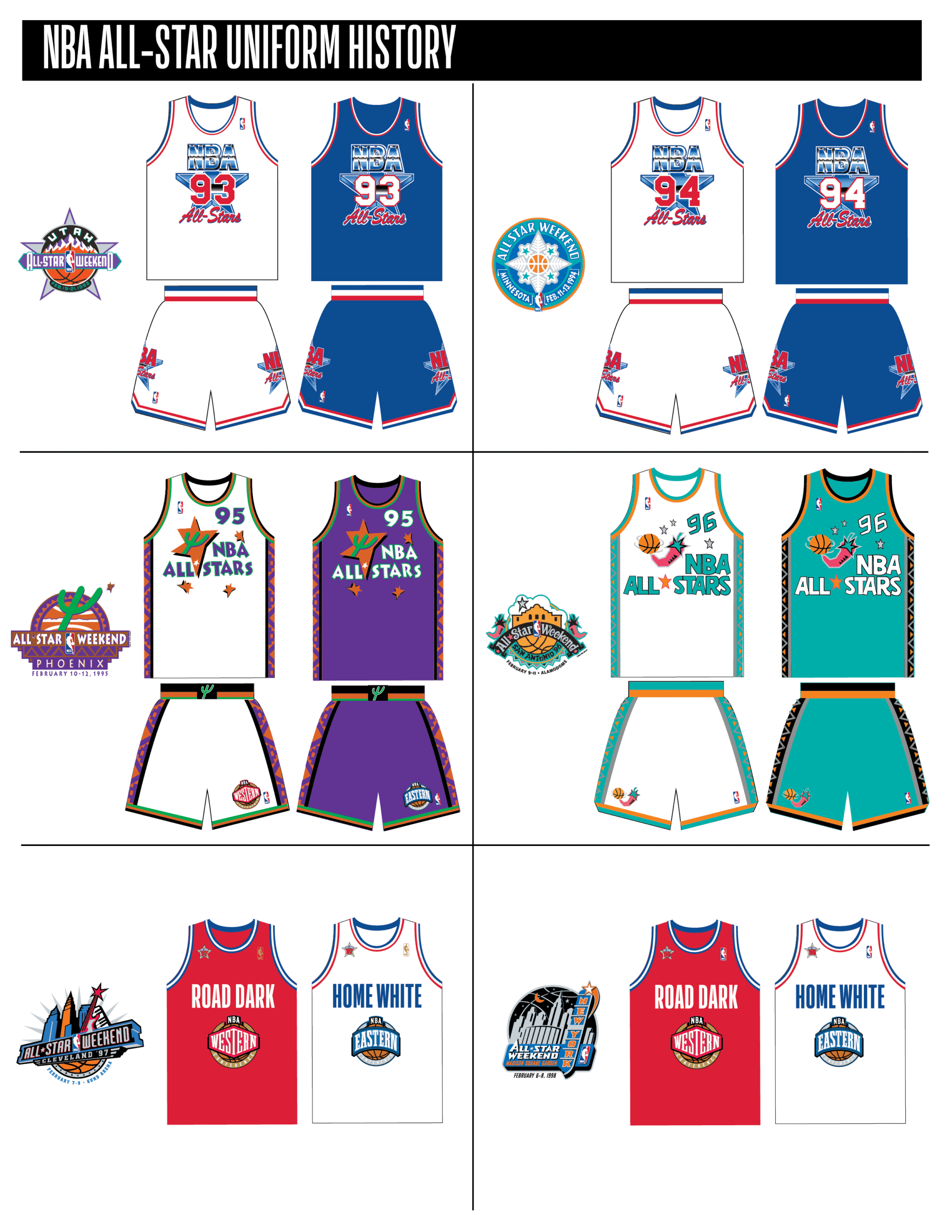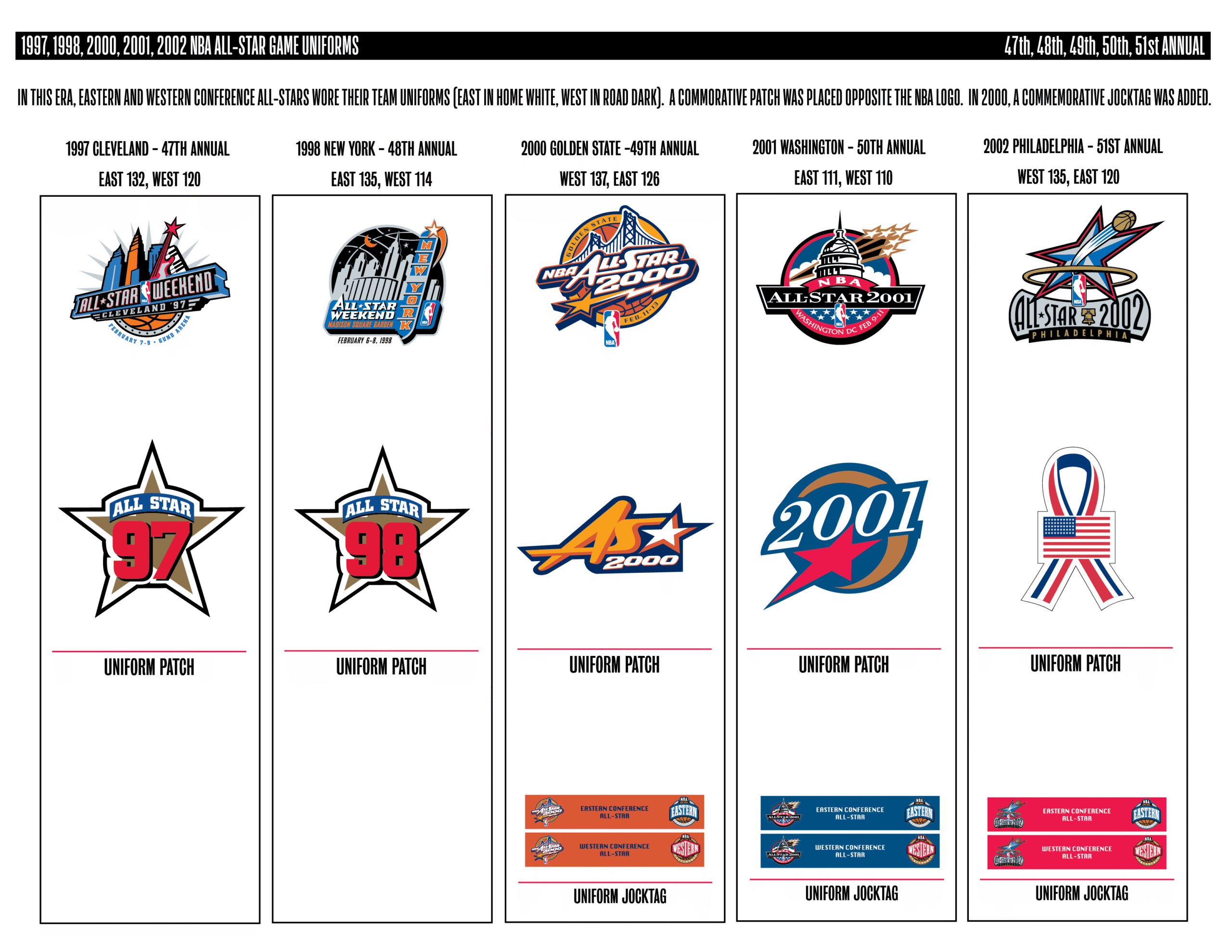 En esta era, los All-Stars de las Conferencias Este y Oeste vestían los uniformes de sus equipos (Este con blanco local, Oeste con uniforme oscuro). Se colocó un parche conmemorativo frente al logo de la NBA. En 2000, se añadió un jocktag conmemorativo.
