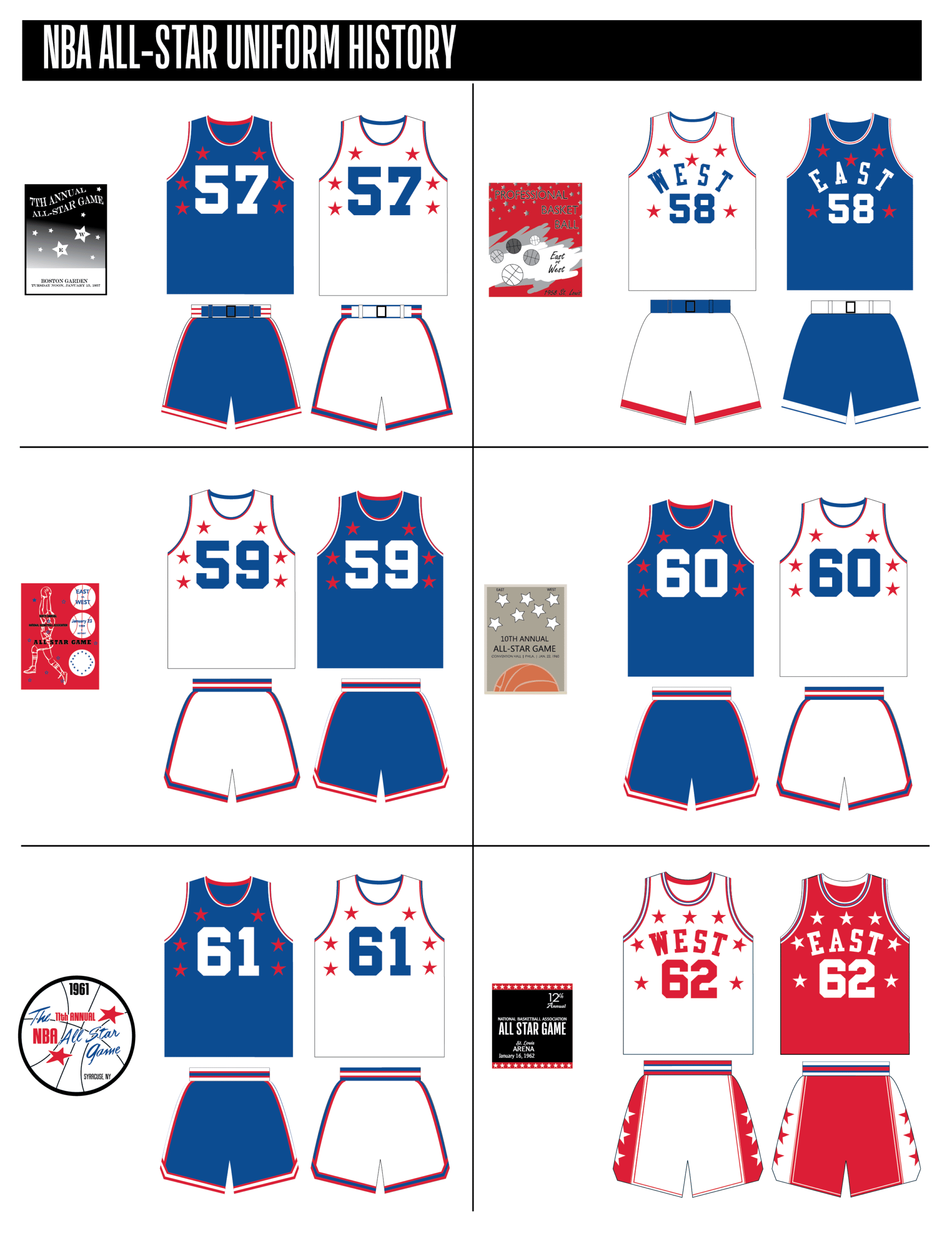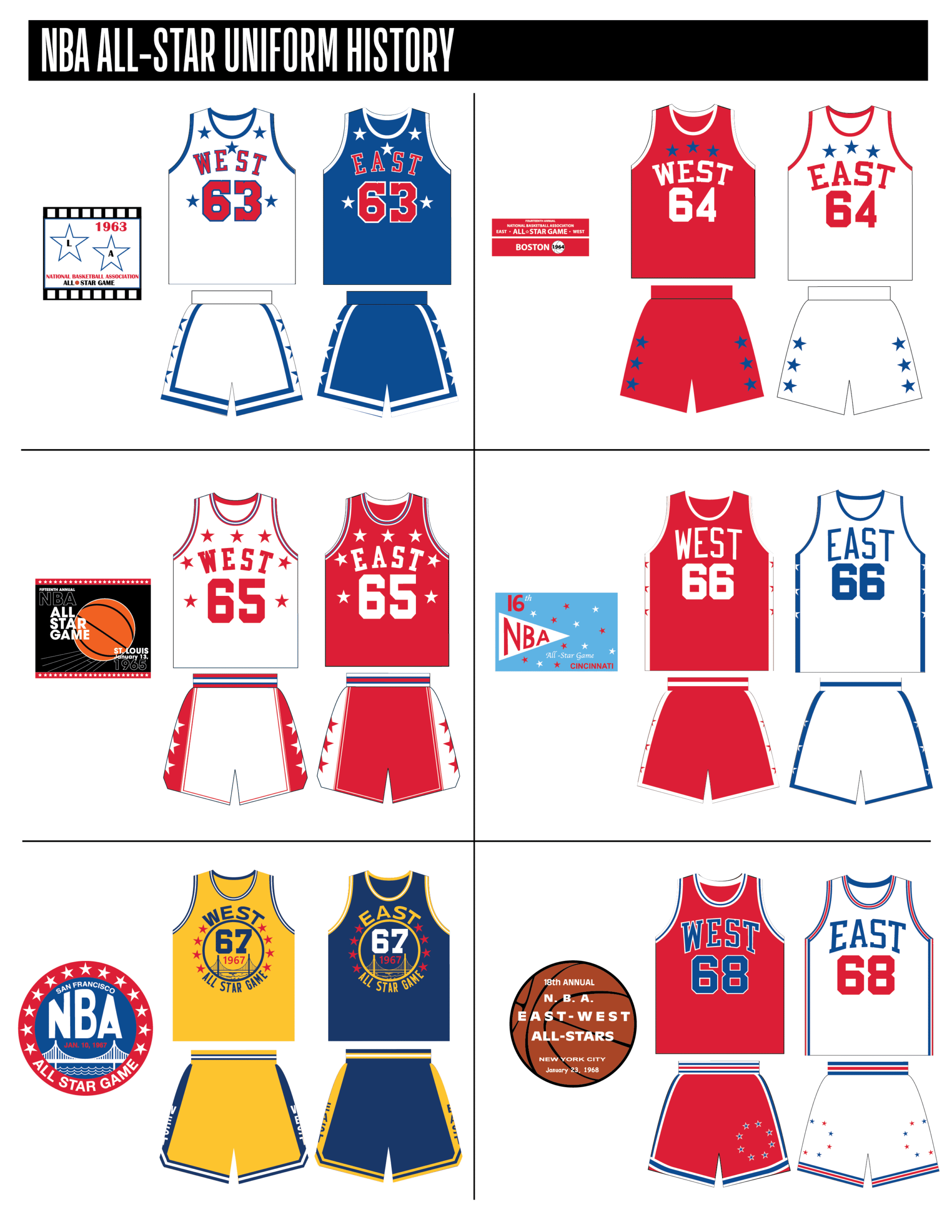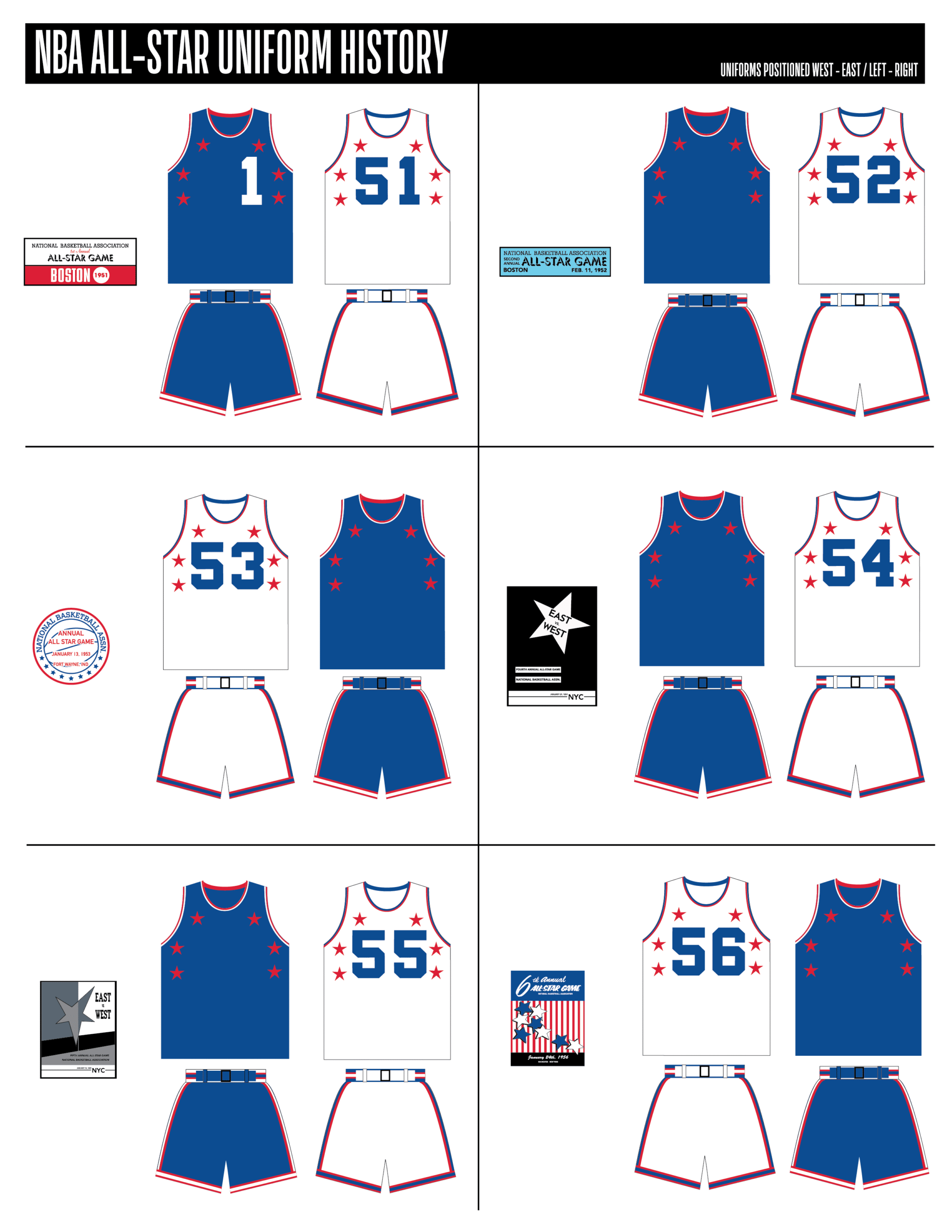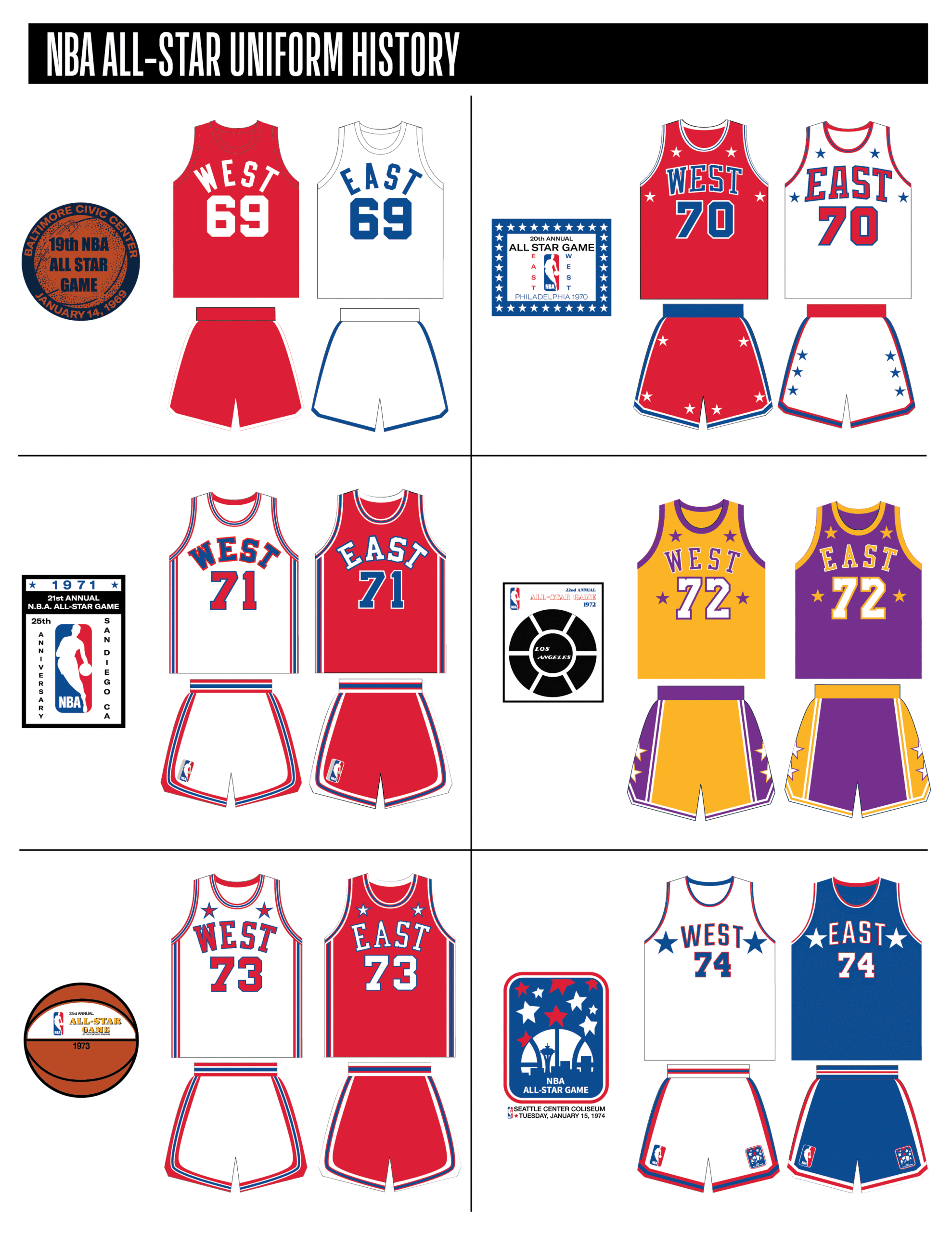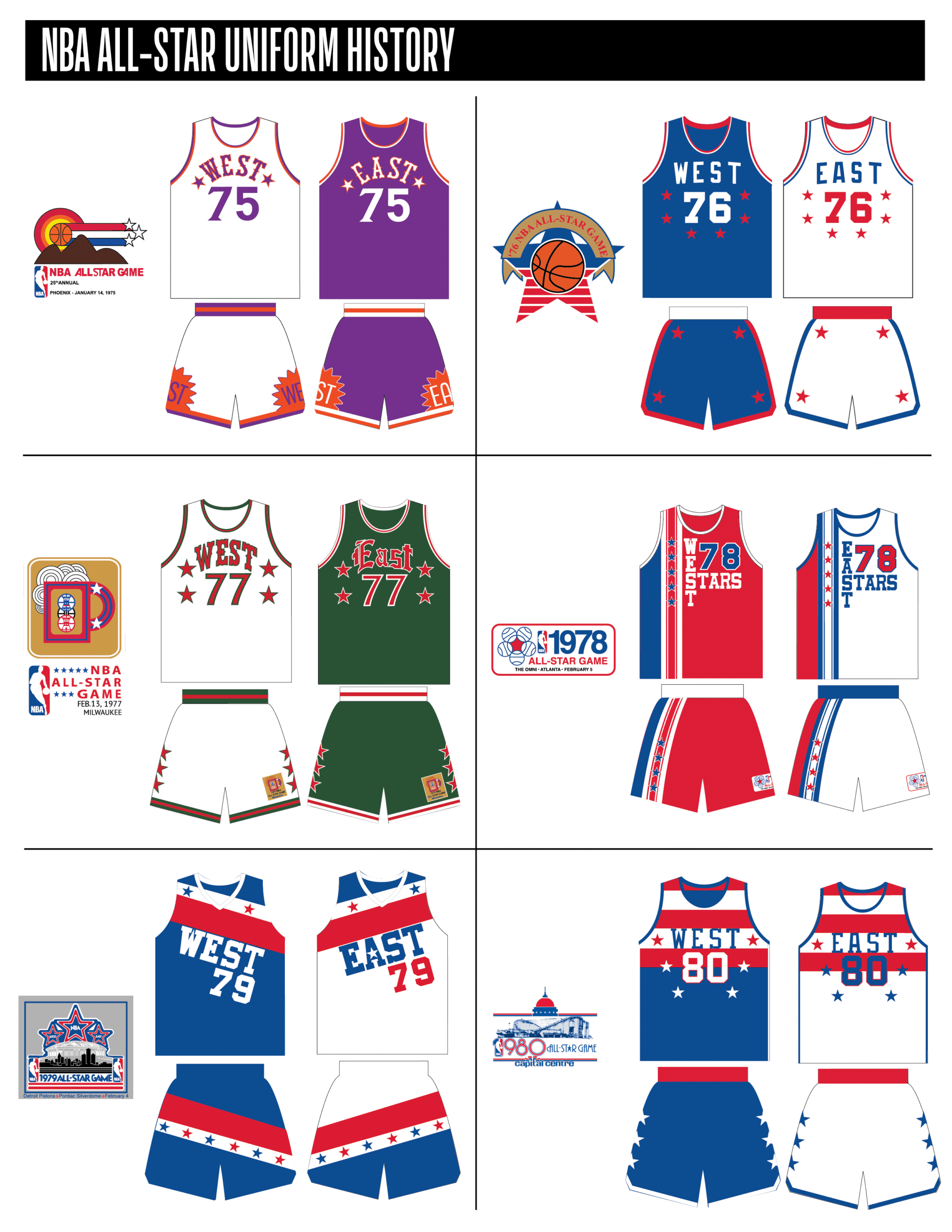 En esta era, los All-Stars de las Conferencias Este y Oeste vestían los uniformes de sus equipos (Este con blanco local, Oeste con uniforme oscuro). Se colocó un parche conmemorativo frente al logo de la NBA. En 2000, se añadió un jocktag conmemorativo.