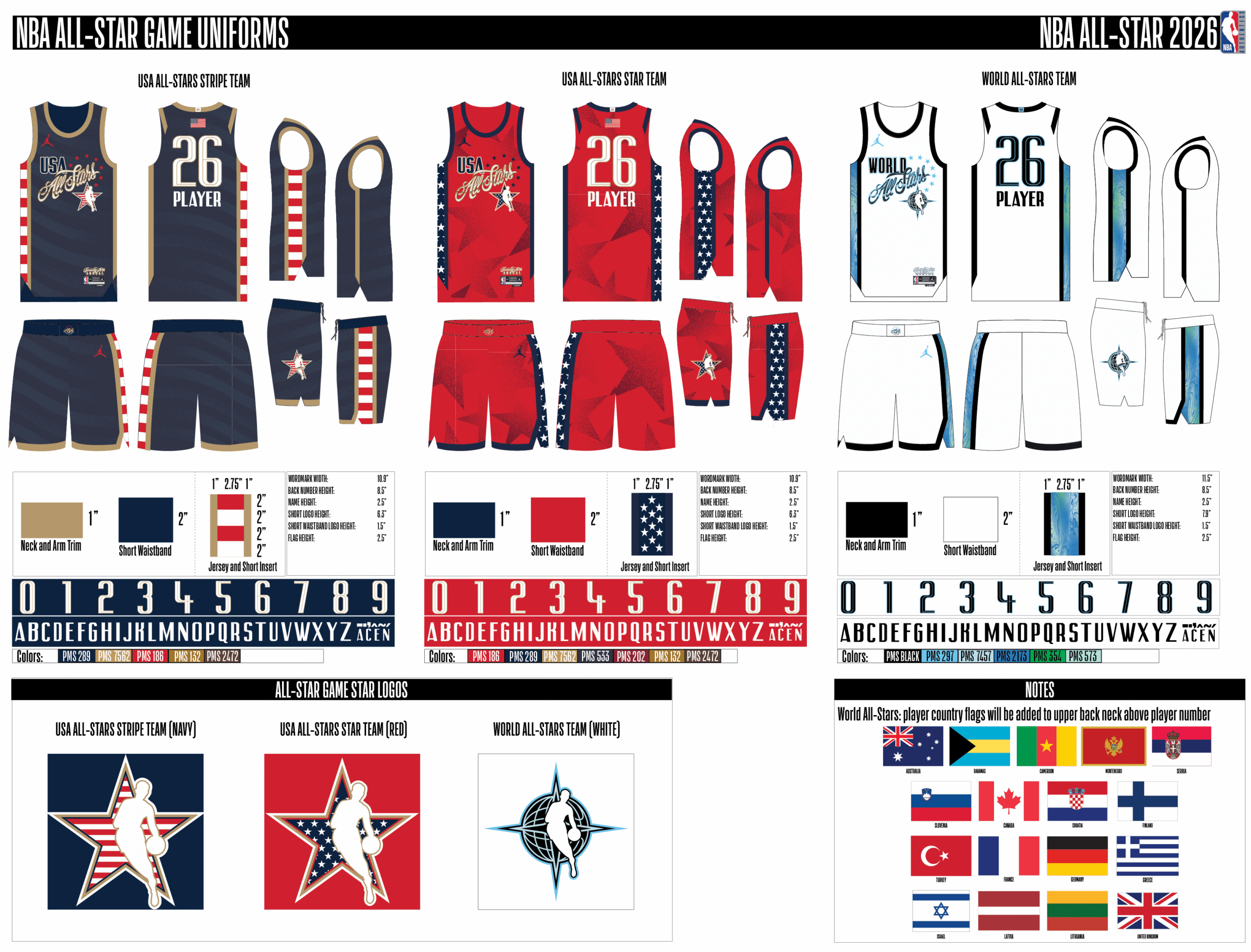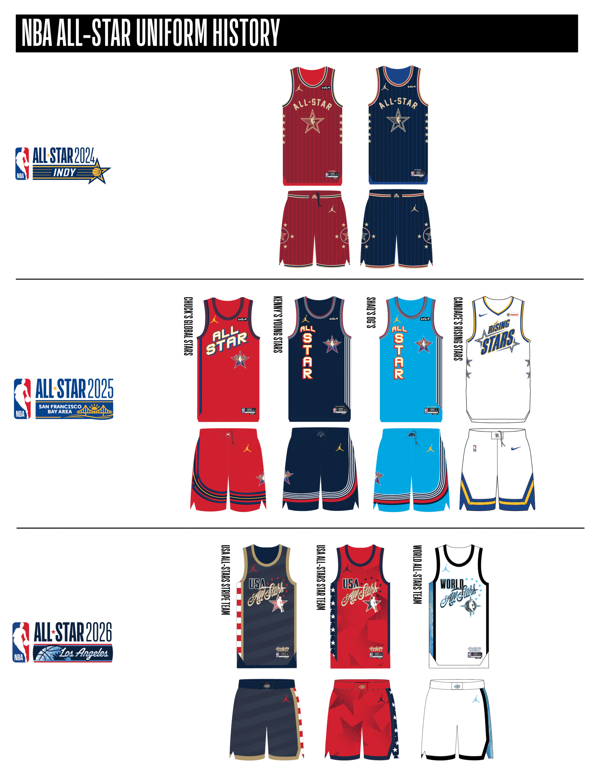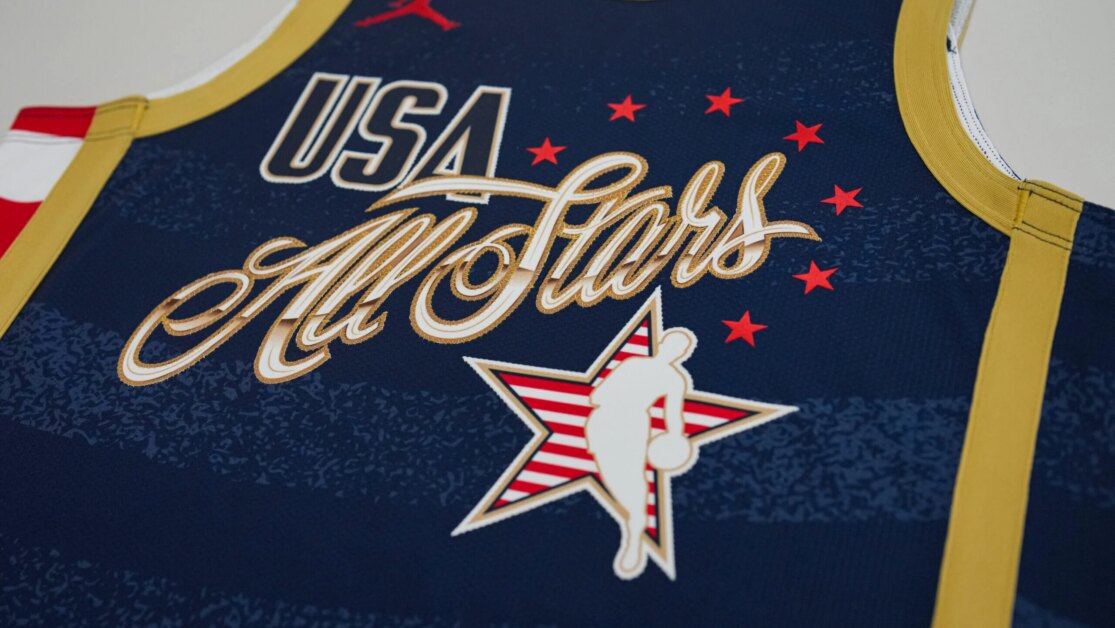 El Juego de Estrellas de la NBA 2026 contará con diseños de uniformes para USA Stars, Team World y USA Stripes (de izquierda a derecha).