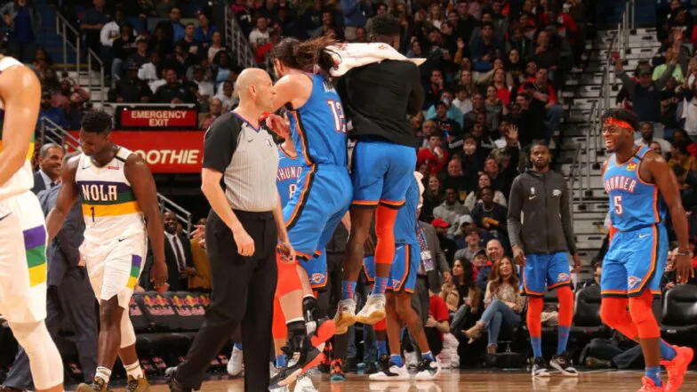 Luego, los triples se limitan básicamente a las bombas de final de cancha/tres cuartos de cancha, como la que Steven Adams hizo para el Oklahoma City Thunder el 13 de febrero de 2020. Lo lanzó, con una mano, desde media cancha al final de la primera mitad contra los New Orleans Pelicans. Y cuando cayó el disparo, Adams, ese neozelandés corpulento y tatuado, se movía como curry.