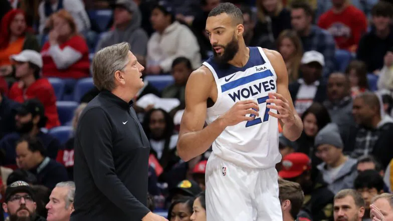 Rudy Gobert habla con el entrenador de Minnesota, Chris Finch, durante un partido.