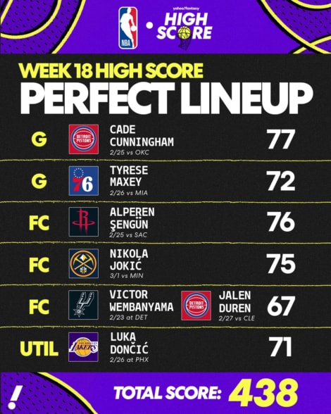 A mitad de la semana 18 de la temporada de baloncesto de fantasía, tuvimos un choque de los mejores equipos de ambas conferencias con los Pistons enfrentándose al Thunder. Detroit saldría victorioso con Shai Gilgeous-Alexander No estoy del todo listo para regresar de una lesión. Sin embargo, SGA pudo devolver el siguiente juego para OKC y anotar 69 puntos Fantasy en una victoria sobre los Nuggets. Ese total no fue suficiente para colocarlo en la alineación perfecta. Echemos un vistazo a los jugadores que lograron sobrevivir y probablemente ayudaron a su equipo de fantasía a obtener una W la semana pasada.